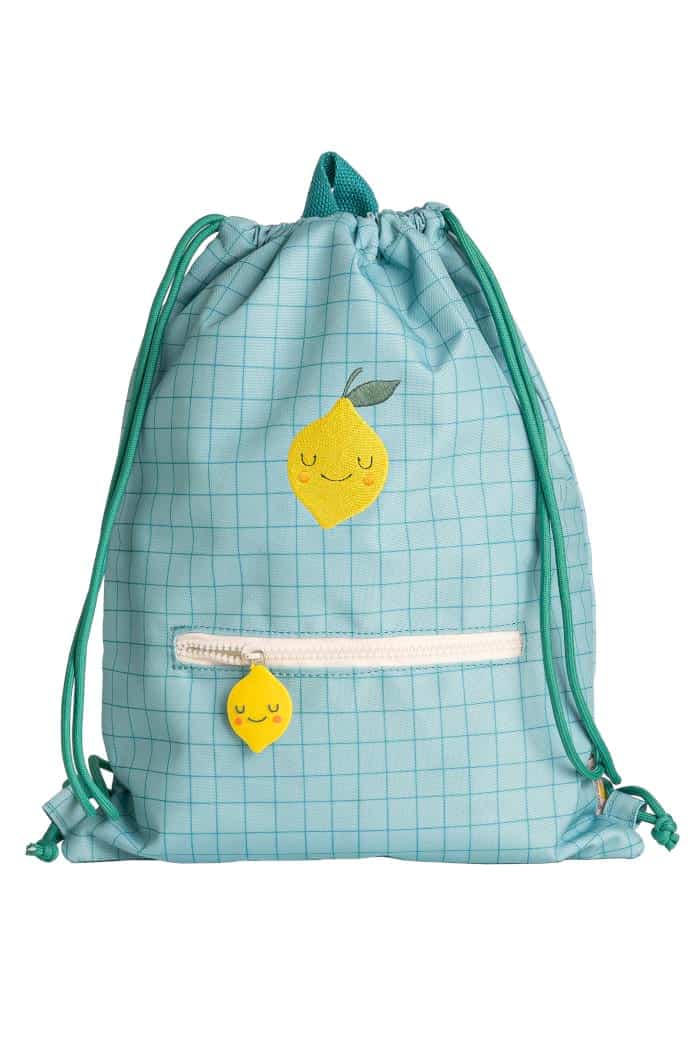Kinder Turnbeutel mit Außentasche kariert, gestickter Zitrone, Zitronenanhänger & Lasche in Türkis Blau aus hochwertigem recyceltem PET von THE COTTON CLOUD - Vorderansicht Kinderturnbeutel Lola the Lemon Drawstring Bag für Kindergarten, Schule, Kita, Sport & Freizeit