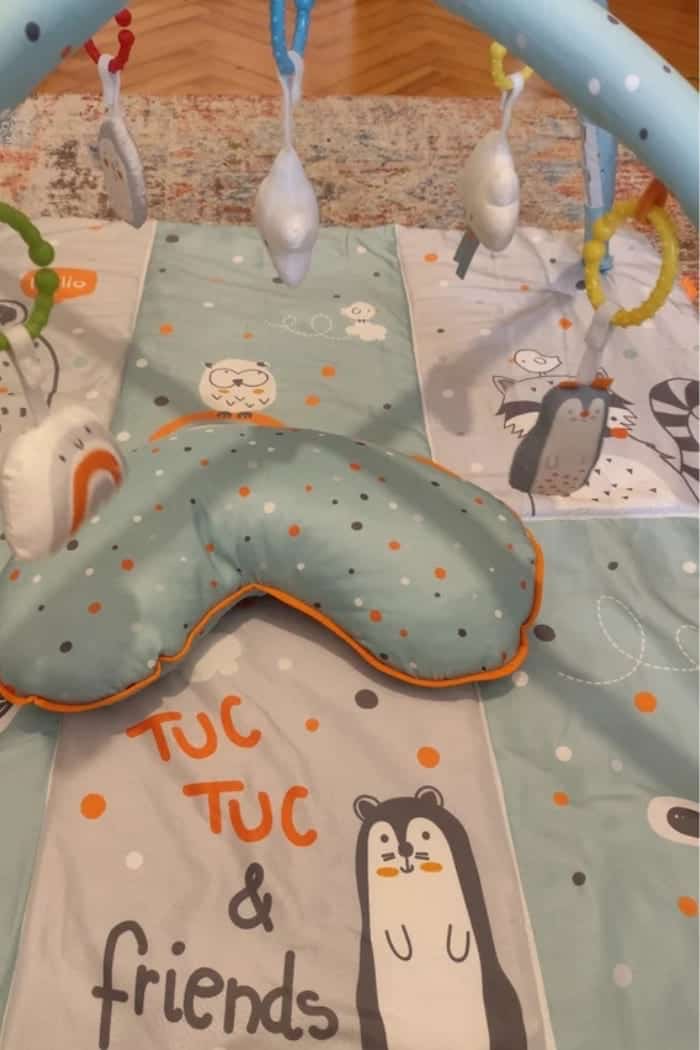 Baby & Kinder Spielbogen mit gepolsterter Decke, Waldtiere gemustert Little Forest & Spielfiguren Igel, Erdmännchen, Regenbogen, Stern, Wolke von TUC TUC - Vorderansicht türkise Krabbeldecke mit Spielbögen Activity