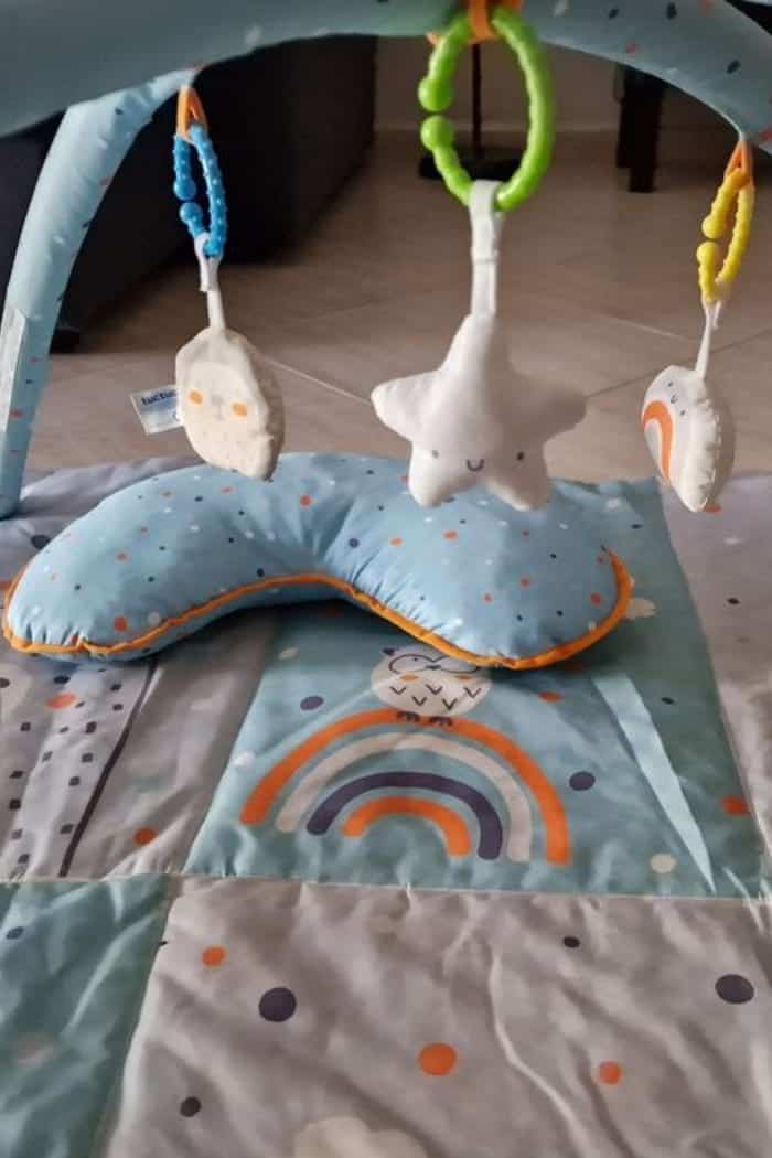 Der Spielbogen mit den bunten Farben und unterschiedlichen Formen gestaltet, die das Baby visuell stimulieren und dabei helfen, die Sehfähigkeit und das Erkennen von Mustern zu entwickeln